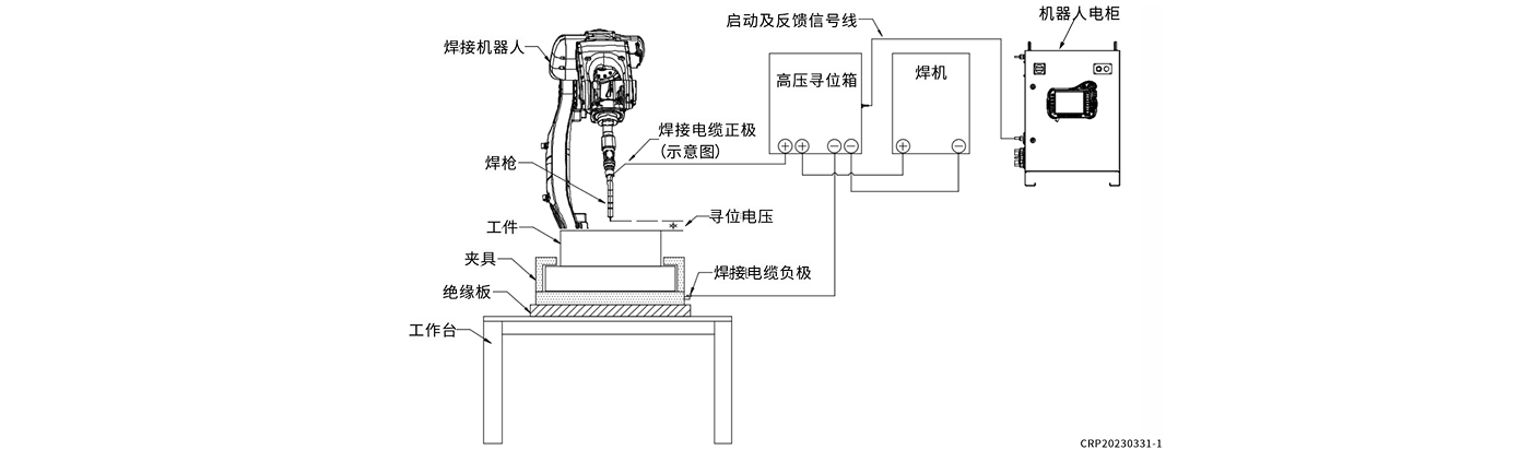 本设备配合焊接机器人的焊丝寻位功能,反馈焊丝在碰到工件的信号,机器人自动计算位置的偏差,修正位置点,使机器人寻到实际的焊接点。